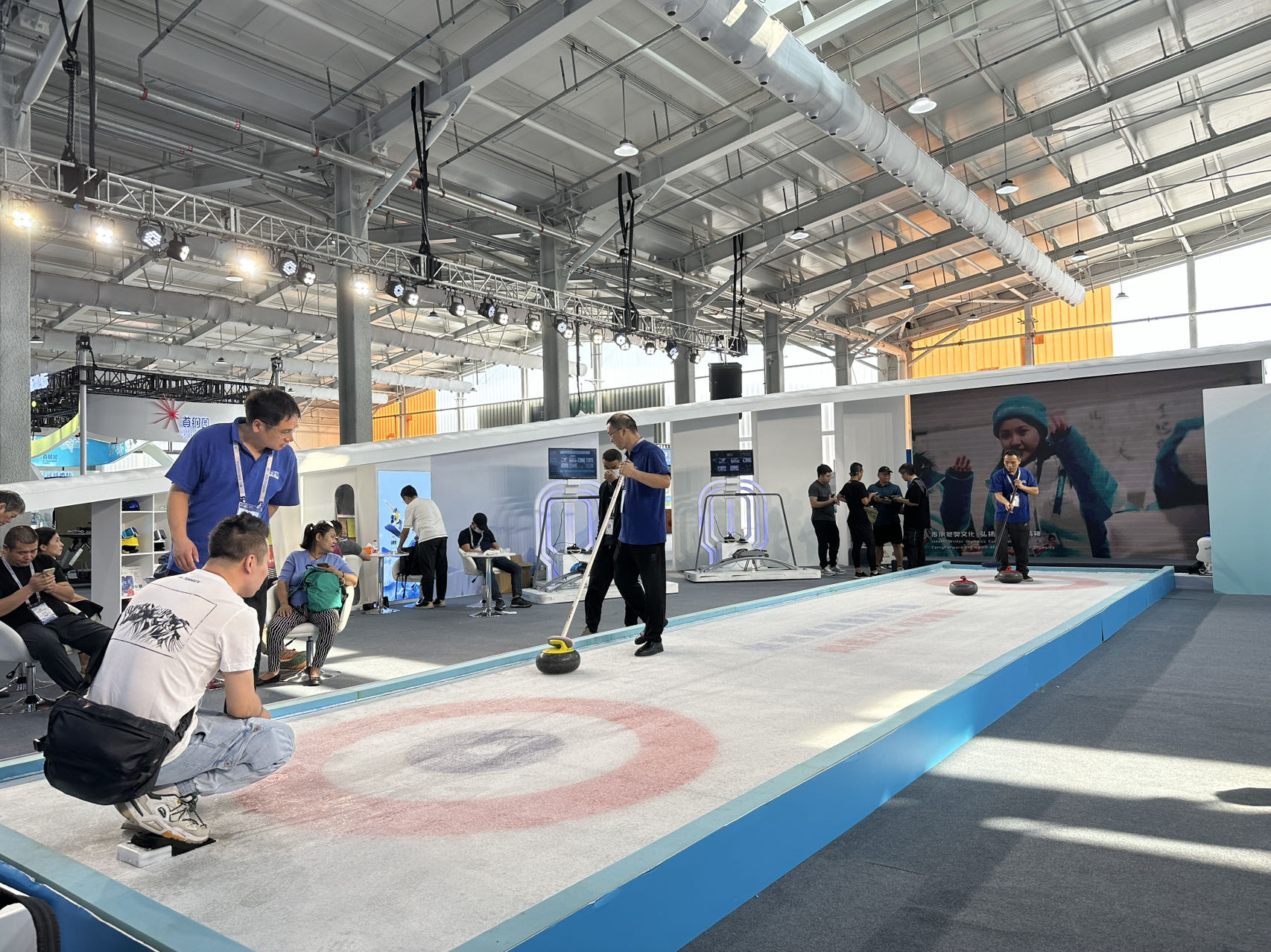 在瀚海鲸舟展位,观众可以体验仿真冰冰壶,体会冰壶的稳和准,感受慢节奏之下的胜利狂欢。北京瀚海鲸舟冰雪体育发展有限公司总经理刘猛告诉记者:“我们参加展会的目的就是让更多人知道,冰壶运动不仅仅是体育项目,我们已经在和越来越多的文化和旅游项目结合,比如有些民宿、酒店就引入了我们的仿真冰冰壶。”