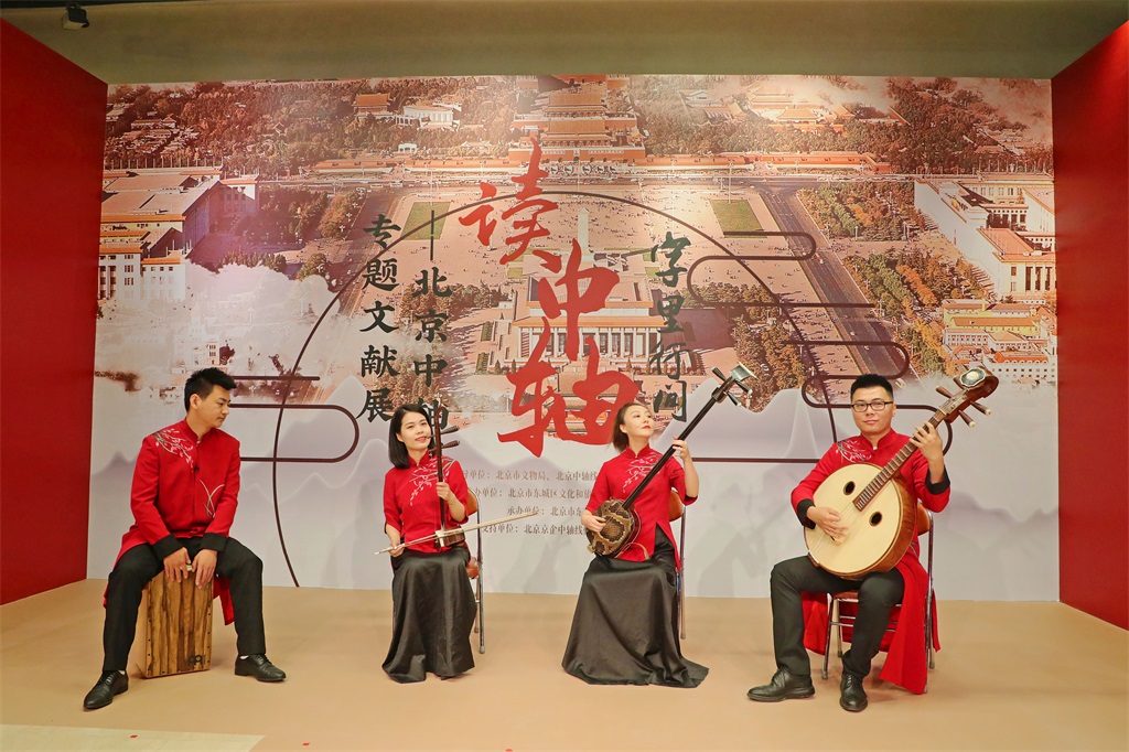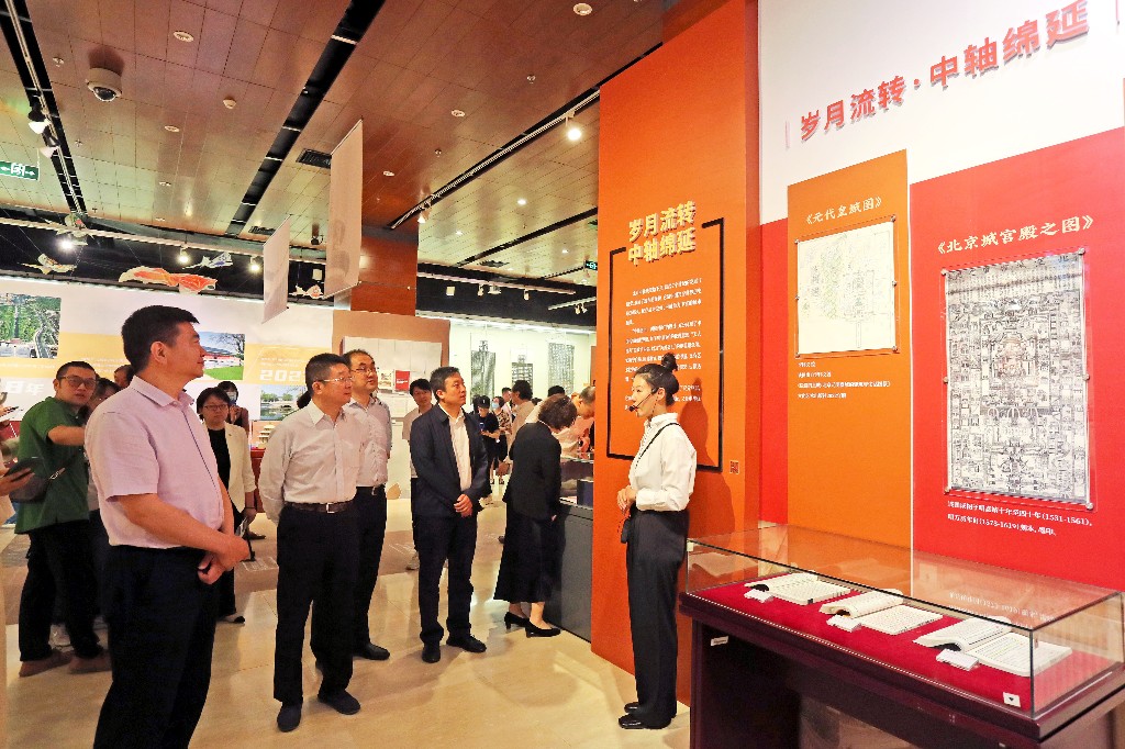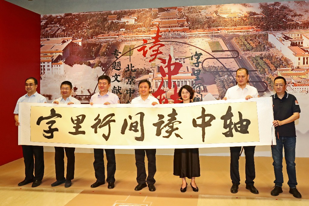 活动开幕仪式现场,北京市文物局副局长褚建好,北京市文化和旅游局副局长王洪涛,北京市东城区副区长唐立,展览主办单位以及北京京企中轴线保护公益基金会的嘉宾共同展开写有“字里行间读中轴”的卷轴,一场讲述壮观中轴、人文中轴、多彩中轴的展览正式拉开序幕。