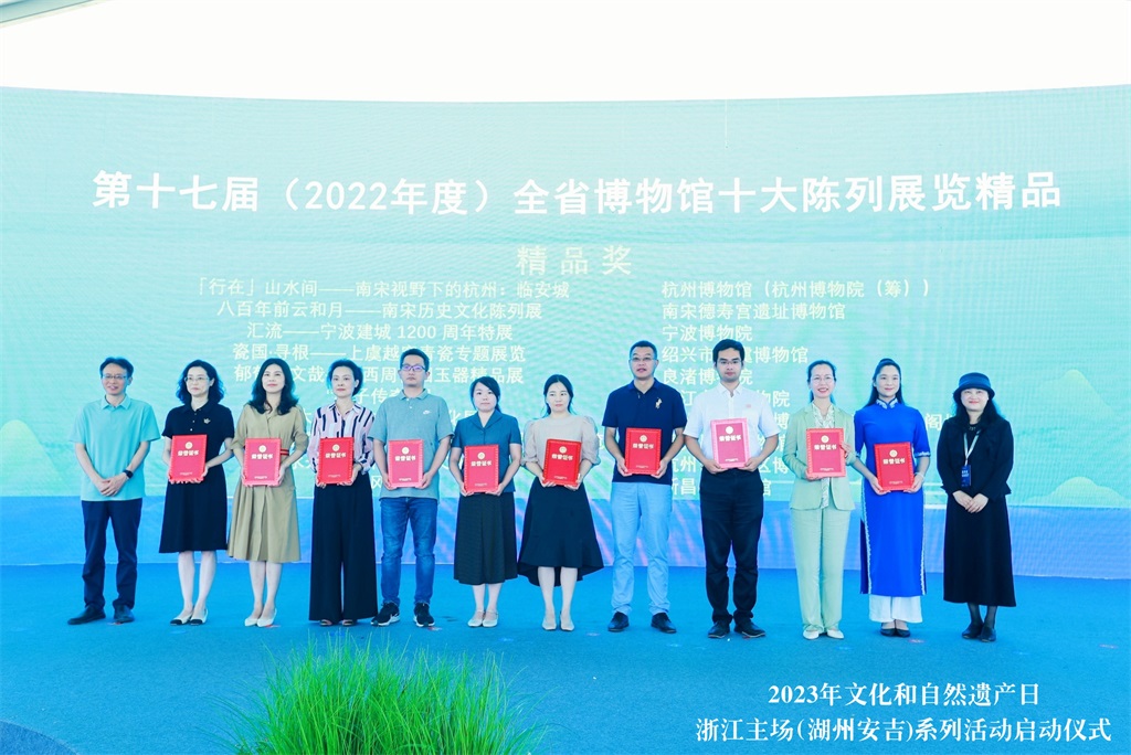 现场,第十七届(2022年度)全省博物馆十大陈列展览精品奖颁奖仪式举办;2022年度浙江考古重要发现、2022年度全国十大考古新发现、第二十届(2022年度)全国博物馆十大陈列展览精品奖、2022年度全国文化遗产十佳图书、2022年度全国文化遗产优秀图书、全国文物事业高质量发展优秀案例、第五届全国“最美文物安全守护人”等名单、奖项发布;“浙江考古与中华文明”丛书赠书仪式和安吉古城国家考古遗址公园揭牌仪式举行;5条集中展示专题历史文化的文物主题游径发布;全省各设区市文物保护志愿队和湖州市各县(区)文物保护志愿队代表授旗仪式举办。