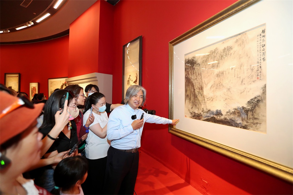 吴为山为观众介绍傅抱石的画作《待细把江山图画》 记者 陈晨 摄