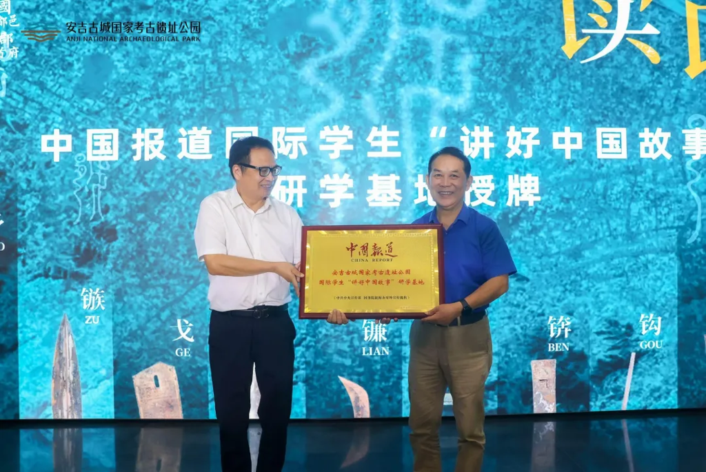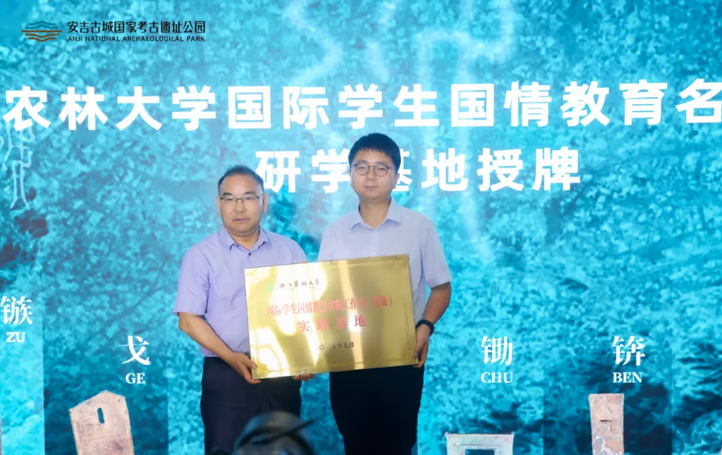 中国报道长三角主编焦峰华、浙江农林大学国际教育学院院长赵有华为安吉古城国家考古遗址公园授牌,这些单位将成为助力越文化破圈传播,以及中外青年解读中华文明的重要力量,谱写优势互补、共同发展的新篇章。