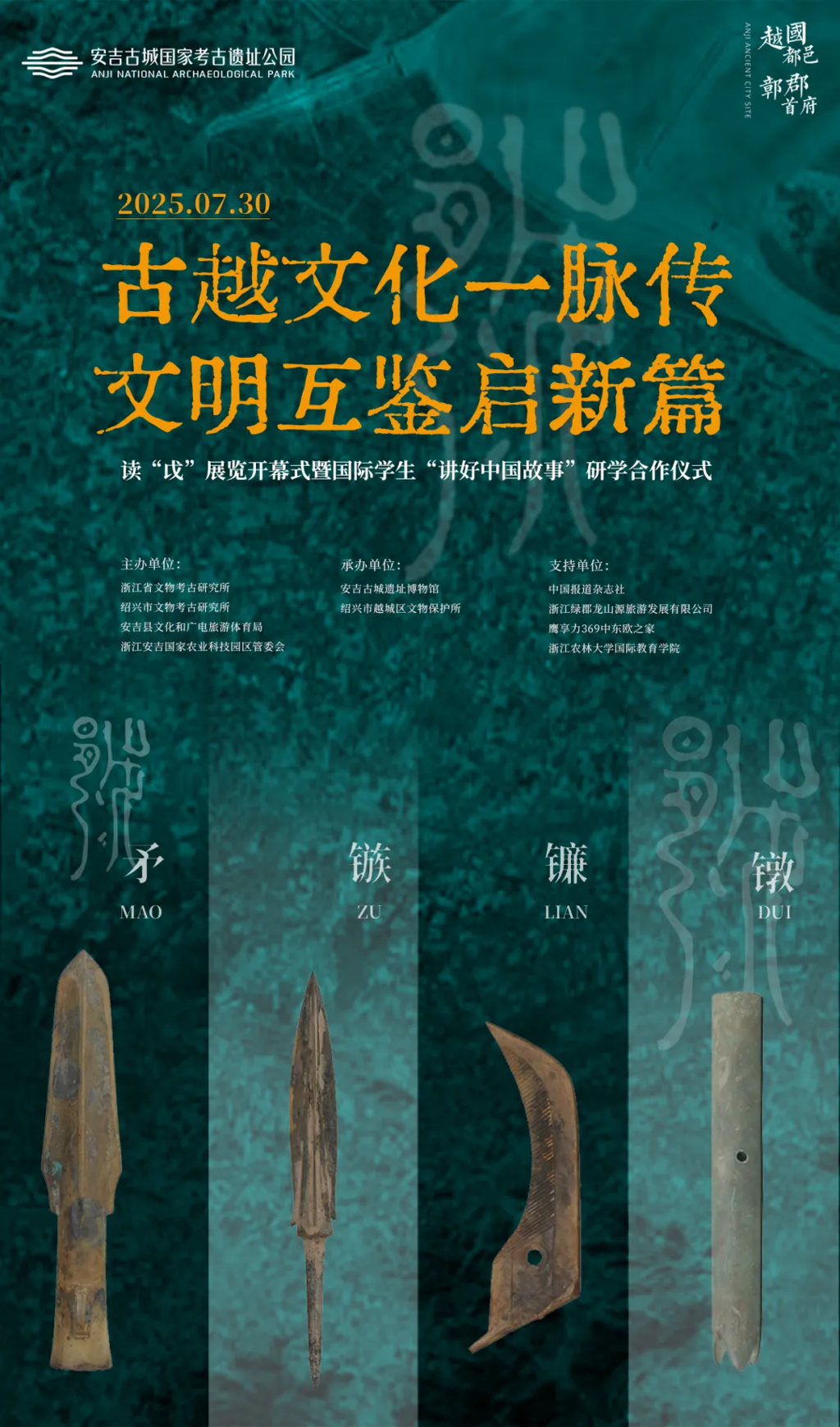 7月30日,读“戉”展览开幕式暨国际学生“讲好中国故事”研学合作仪式在浙江安吉古城国家考古遗址公园隆重举行。活动以“古越文化一脉传,文明互鉴启新篇”为主题,汇聚国内文博专家、政府代表及塞尔维亚学生团、国际留学生代表,共探千年古越文明,共筑文化传播桥梁。