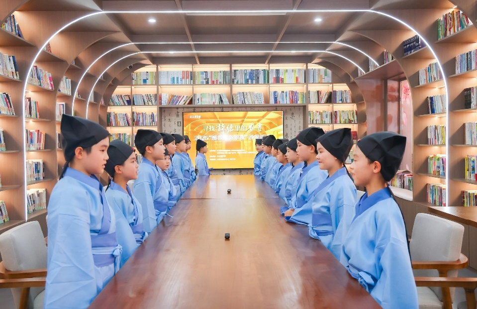 活动伊始,18 名身着传统服饰的小学生在书房一楼中央整齐列队,齐声诵读《诗经》中的经典篇章,清脆童声与悠扬古风音乐交织共鸣,仿佛穿越千年时光,让在场者深切感悟《诗经》中蕴含的质朴情感与古老智慧。