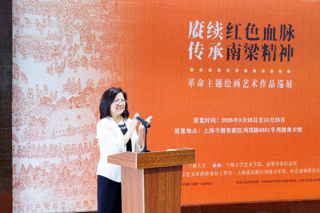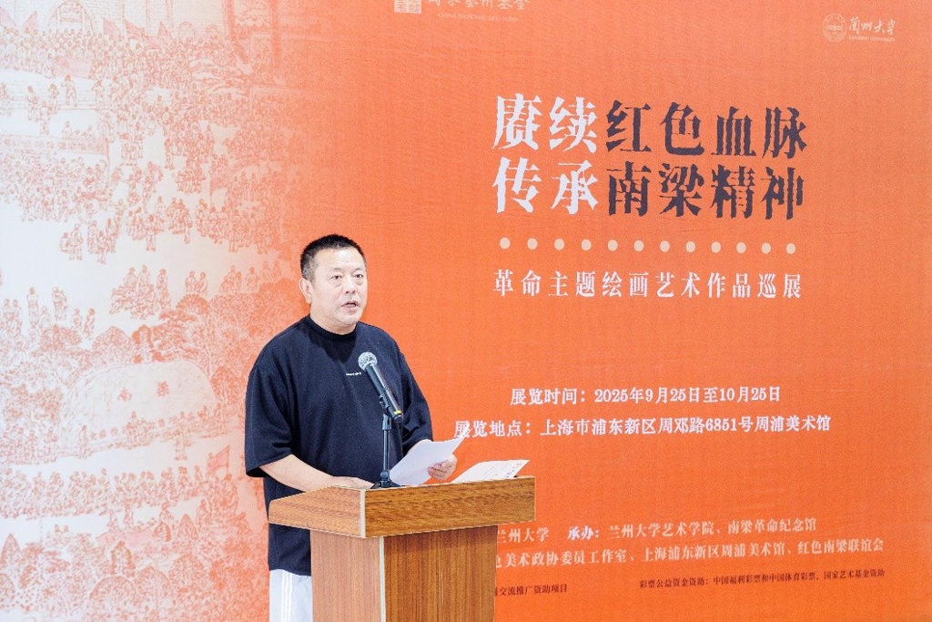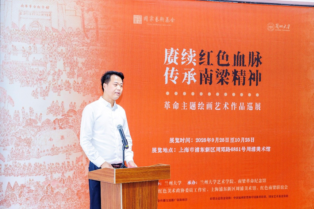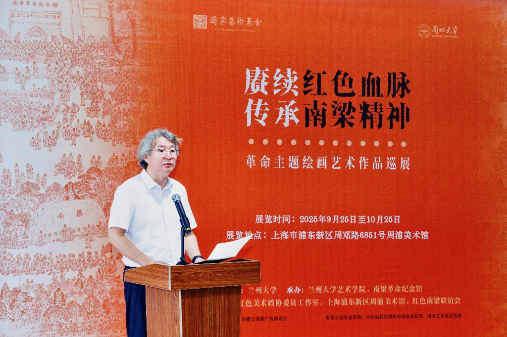 9 月 25 日上午,由兰州大学主办,兰州大学艺术学院、南梁革命纪念馆承办,赵锁平红色美术政协委员工作室、上海浦东新区周浦美术馆、红色南梁联谊会协办的2025年度国家艺术基金传播交流推广资助项目“赓续红色血脉 传承南梁精神——革命主题绘画艺术作品巡展” 上海站开幕式,在浦东新区周浦美术馆隆重举行。
