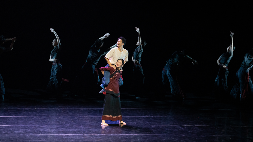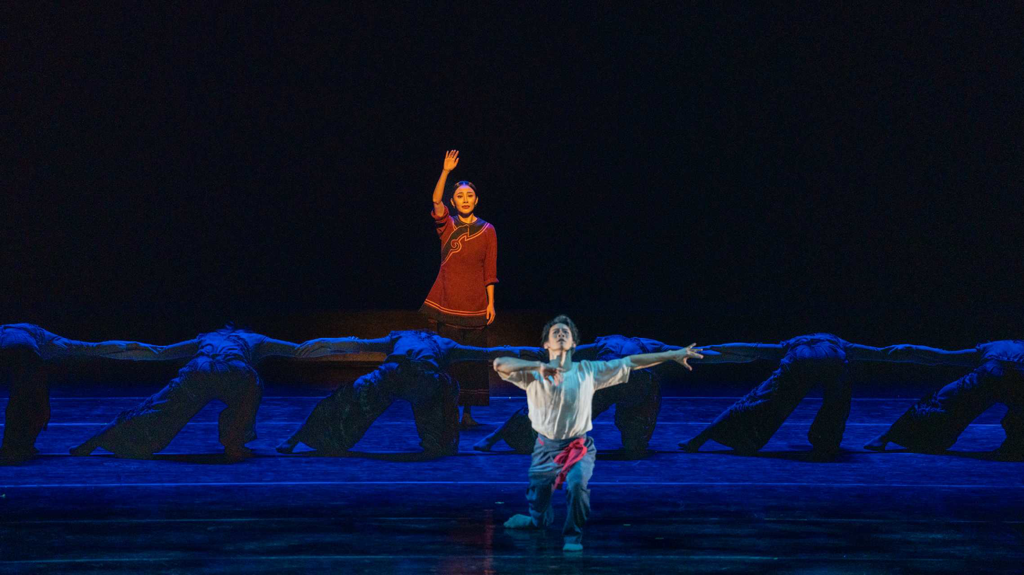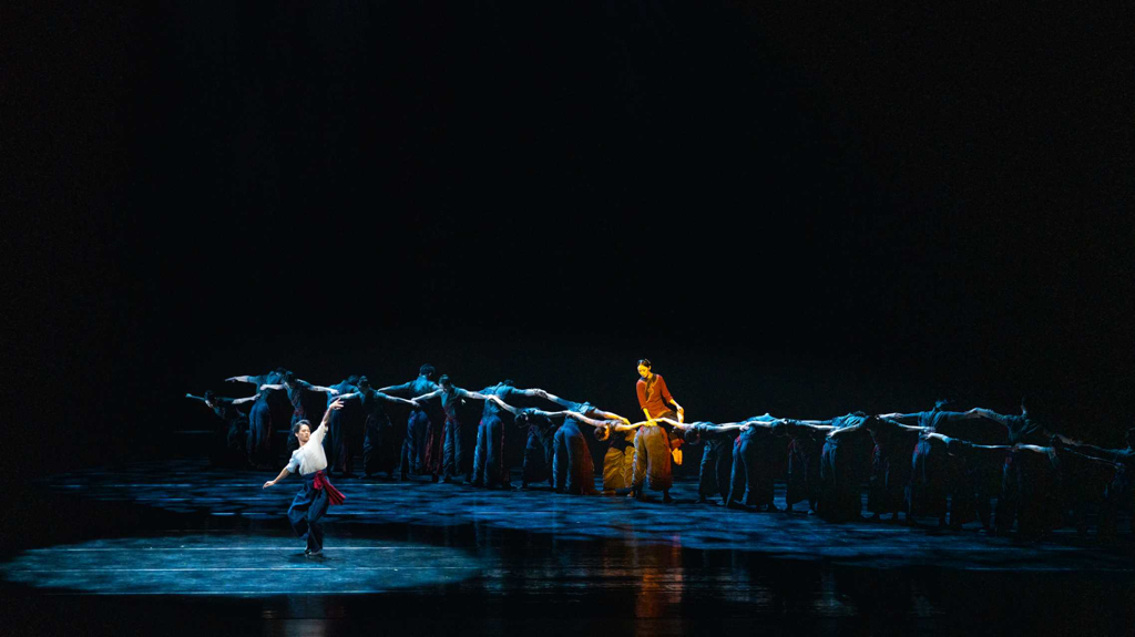 在笔者看来,编导的这一“年轻母亲”的设定是极具当代意识的。这一当代意识也体现在作品中构筑出如海浪般浮沉不定的“石桥”意象。或许“桥”从来都不是人们认为或希望的那样永恒静止,“时间”也从不是线性的河流,而是环形的海:作品发展到中间部分,游子已与母亲告别,将自己投入海浪之中,与海浪搏斗、和海浪同行。搏斗之间,象征着海浪的群舞突然消失,只留游子一人,游子缓缓吸气起身。站在石桥上挥手的母亲又倏然出现在舞台后区,而后游子寻桥而去,却又被众人托举前行。而这次群舞象征的不再是海浪,是一艘回家的船。