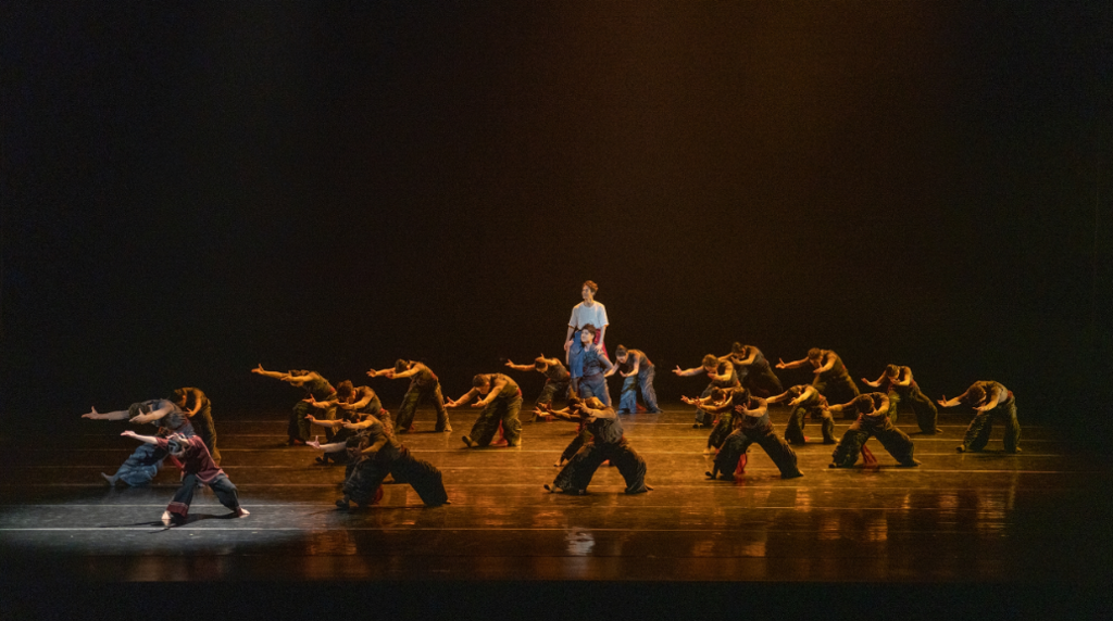 在作品中,编导并没有止步于“石桥”的意象再现,而是运用南音、拍胸舞、福建戏曲等闽派文化元素,书写出一篇跨越时空、感人至深的血脉寓言——母亲与游子“拥抱”、“挥别”:母亲期盼、游子思念。那座桥,便成为母子隔空相望的载体,更似一种“母子间看不见的脐带”隐喻。忽隐忽现的“母亲”与“桥”,已然将实在的物理空间升华为一处精神归途的渡口。然而,这浓郁的情感,也在拍胸舞刚毅的动作质感,以及演员朴拙厚实的身体表达下,变得如海浪一般纯粹、迂回又坚定。