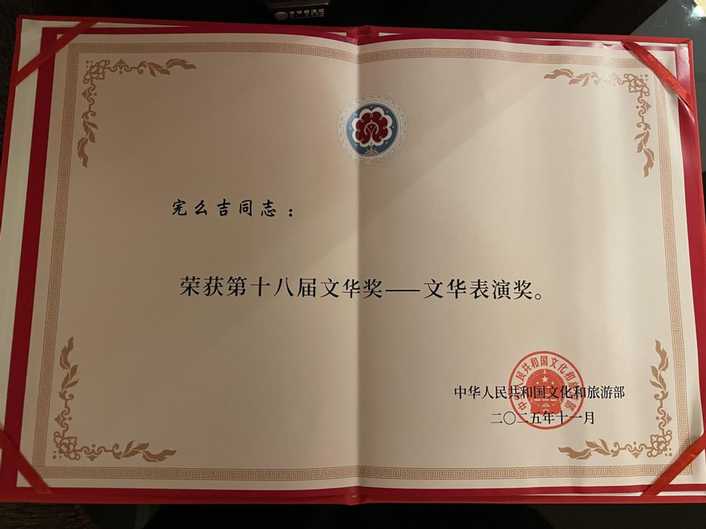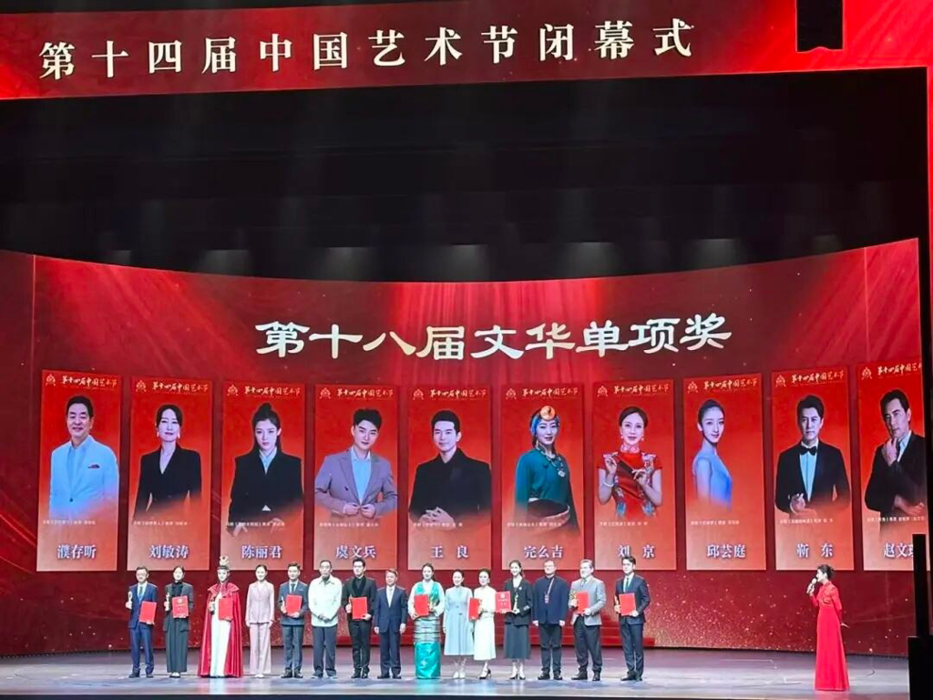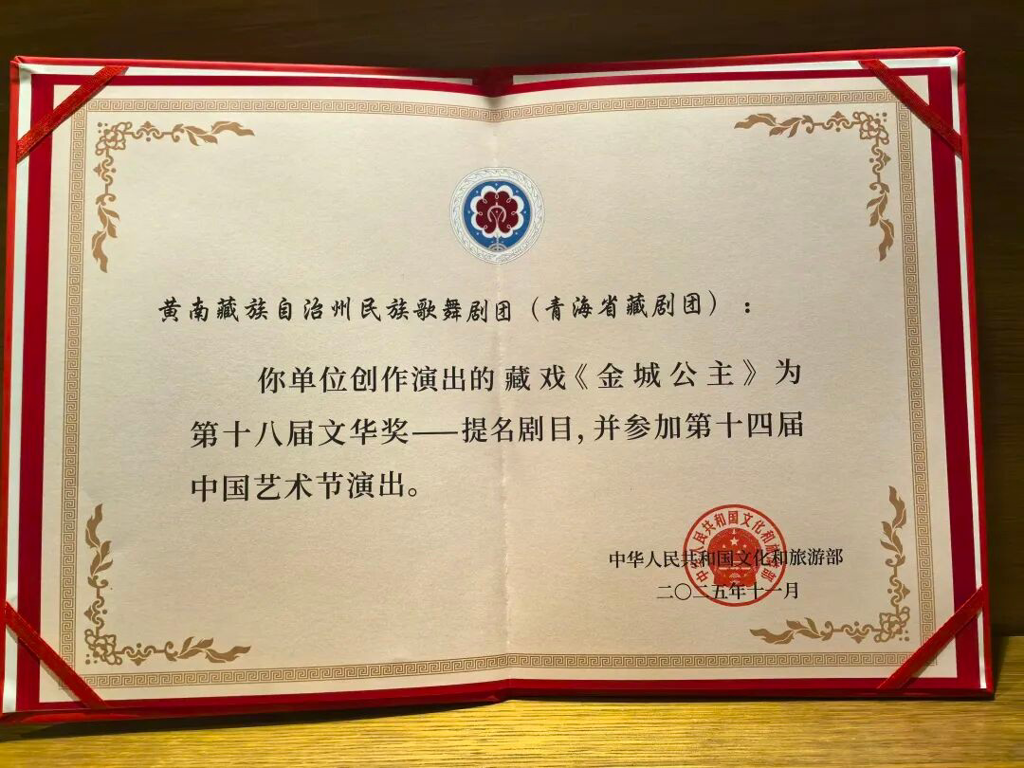 11月4日,第十四届中国艺术节闭幕式暨第十八届文华奖颁奖仪式在重庆举行,中共中央政治局委员、重庆市委书记袁家军,文化和旅游部部长孙业礼出席活动。青海省在国家级文化艺术政府最高奖——文华奖领域实现重大突破,由青海省藏剧团(黄南藏族自治州民族歌舞剧团)创排的大型安多藏戏《金城公主》主演完么吉,凭借精湛深沉的舞台表演荣膺文华表演奖(全国仅十个)。这是青海历史上首次摘得“文华表演奖”,为青海舞台艺术再添一抹厚重的国家级荣光。这既是对演员艺术修为的至高肯定,更是青海长期深耕艺术创作、推动文艺繁荣的成果体现。