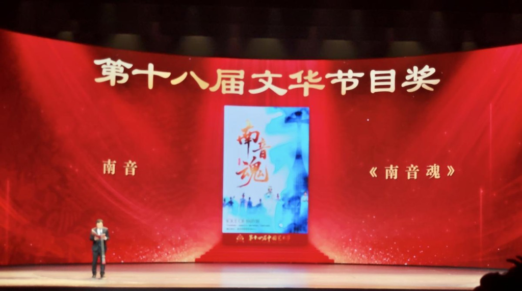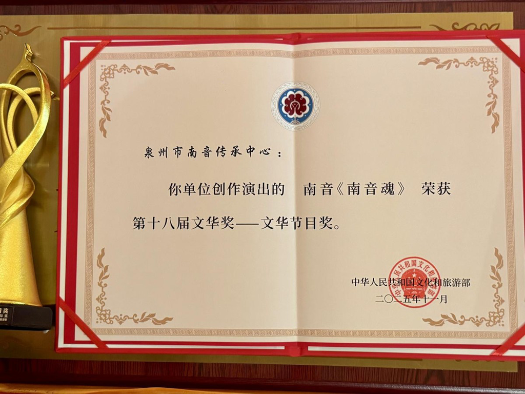 中国艺术节是我国规格最高、规模最大、最具影响力的国家级综合性文化艺术盛会,中国文化艺术政府奖——文华奖是文化和旅游部设立的国家舞台艺术政府最高奖,每三年评选一次,“文华节目奖”是本届新设奖项,本届进入文华奖终评的45个节目(含杂技、曲艺、舞蹈、小戏曲等),《南音魂》作为福建省唯一入围文华节目奖终评的作品,从全国顶尖艺术作品中脱颖而出,成功摘奖。