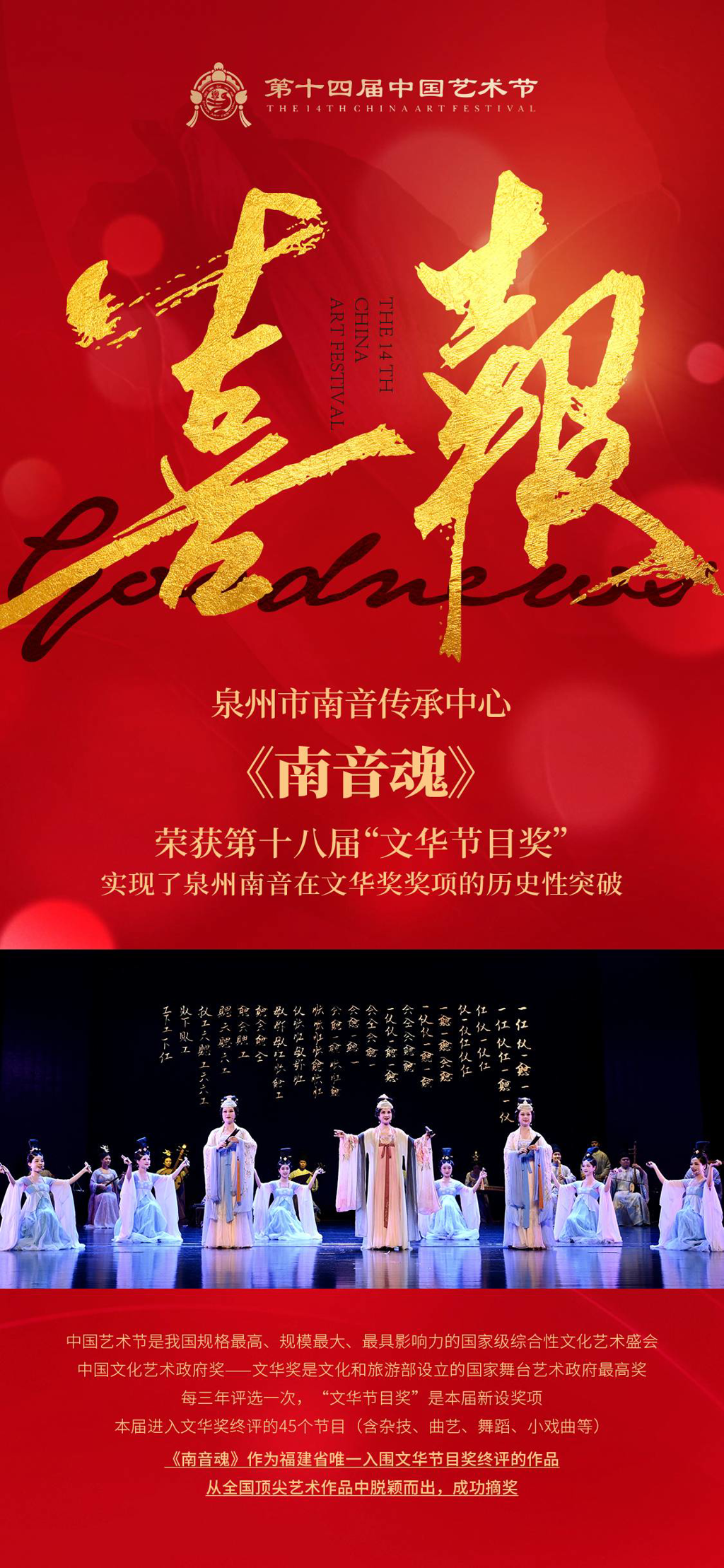 中国艺术节是我国规格最高、规模最大、最具影响力的国家级综合性文化艺术盛会,本届艺术节由文化和旅游部、重庆市人民政府、四川省人民政府主办。中国文化艺术政府奖——文华奖是文化和旅游部设立的国家舞台艺术政府最高奖,每三年评选一次,“文华节目奖”是本届新设奖项,本届进入文华奖终评的45个节目(含杂技、曲艺、舞蹈、小戏曲等),《南音魂》作为福建省唯一入围文华节目奖终评的作品,从全国顶尖艺术作品中脱颖而出,成功摘奖。