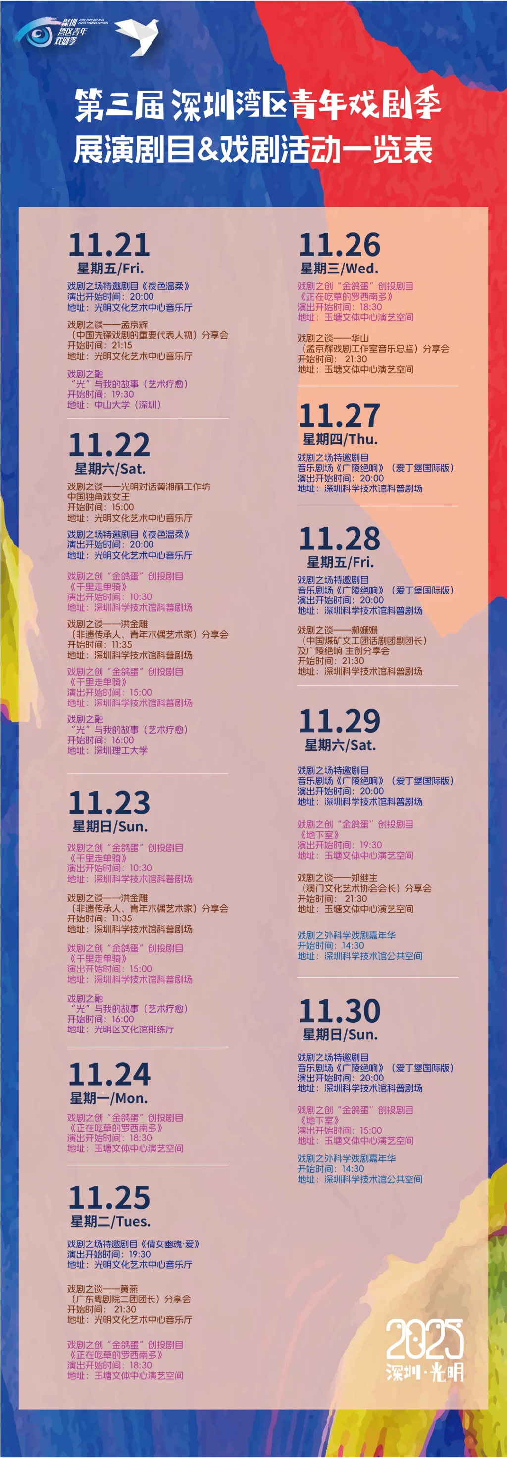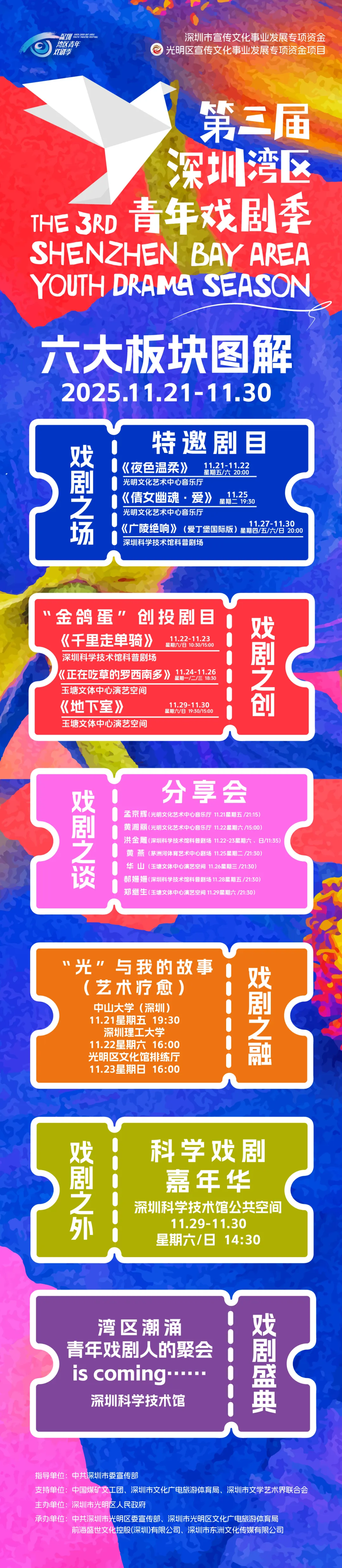 本届青年戏剧季以“码头、源头、远航”为核心主题,寓意深刻。“码头”,是深圳作为开放枢纽的缩影,汇聚四方青年创意在此交汇;“源头”,是戏剧创作灵感的迸发之地,从岭南文化与现代生活中汲取养分;“远航”,象征着青年戏剧人由此启程,承载时代故事,驶向艺术与未来的无垠之境。其立足深圳、面向粤港澳大湾区、辐射全国,集结国内前沿青年戏剧创作力量,打造一场始于剧场而不囿于剧场,融合新空间、新演艺、新体验的艺术狂欢。