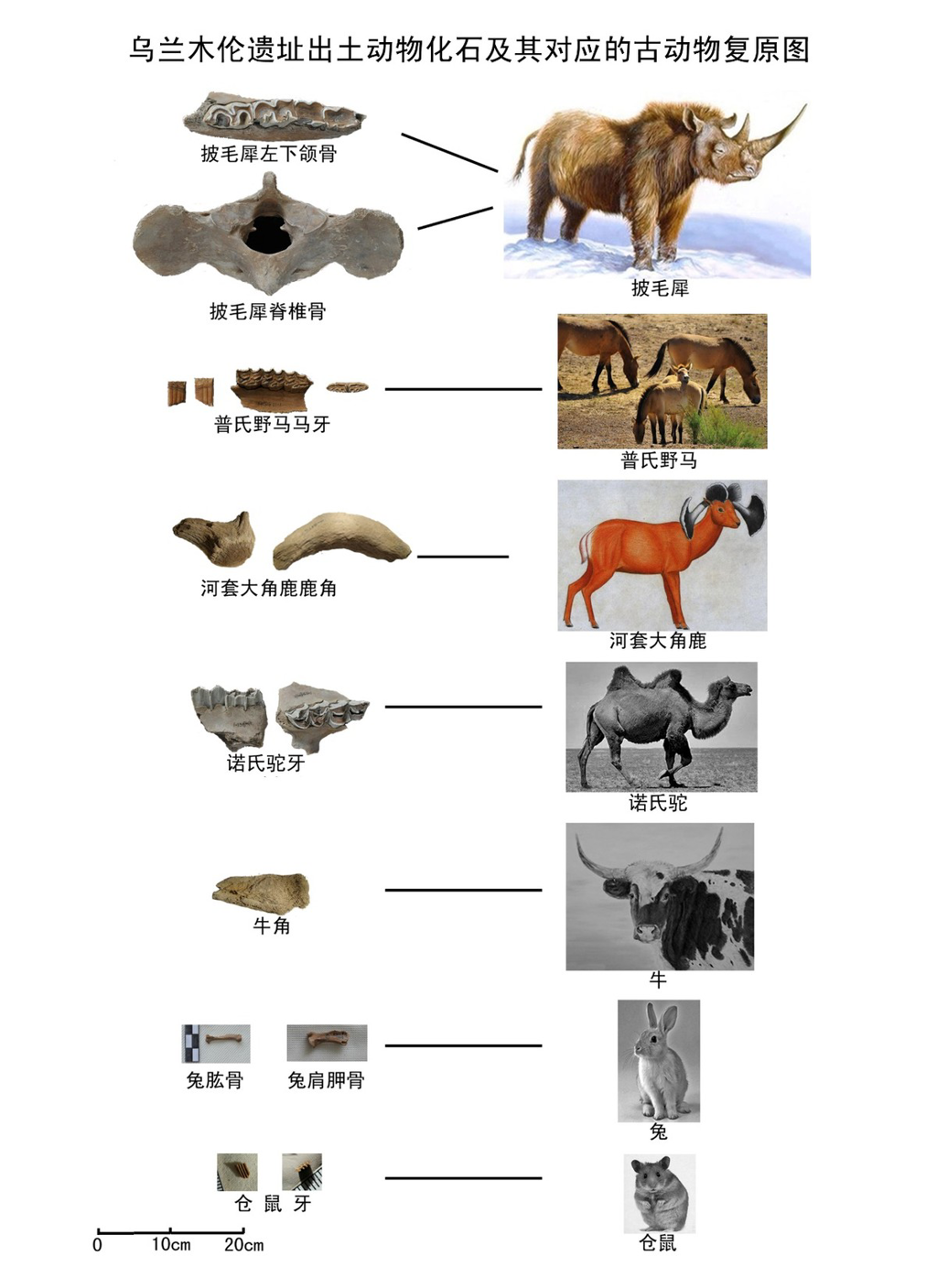 乌兰木伦遗址出土动物化石及其对应的古动物复原图