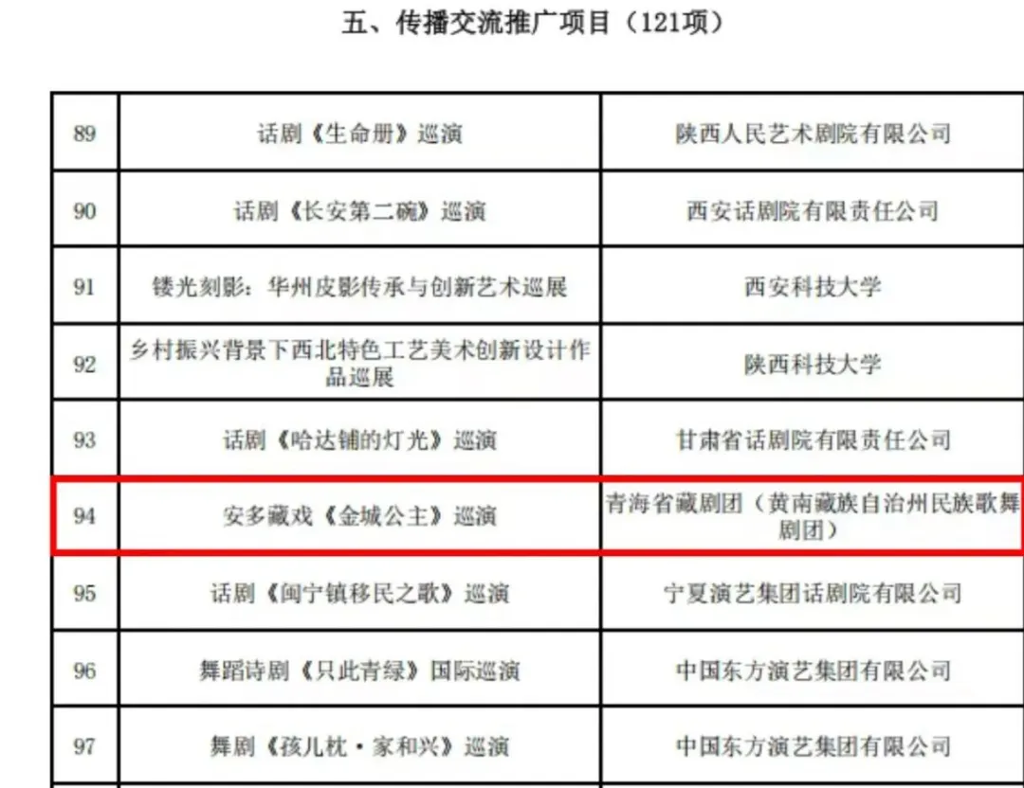剧团精心创排的大型安多藏戏《金城公主》成功入选国家艺术基金传播交流推广项目,该剧以厚重的历史底蕴、鲜明的民族特色和精湛的艺术呈