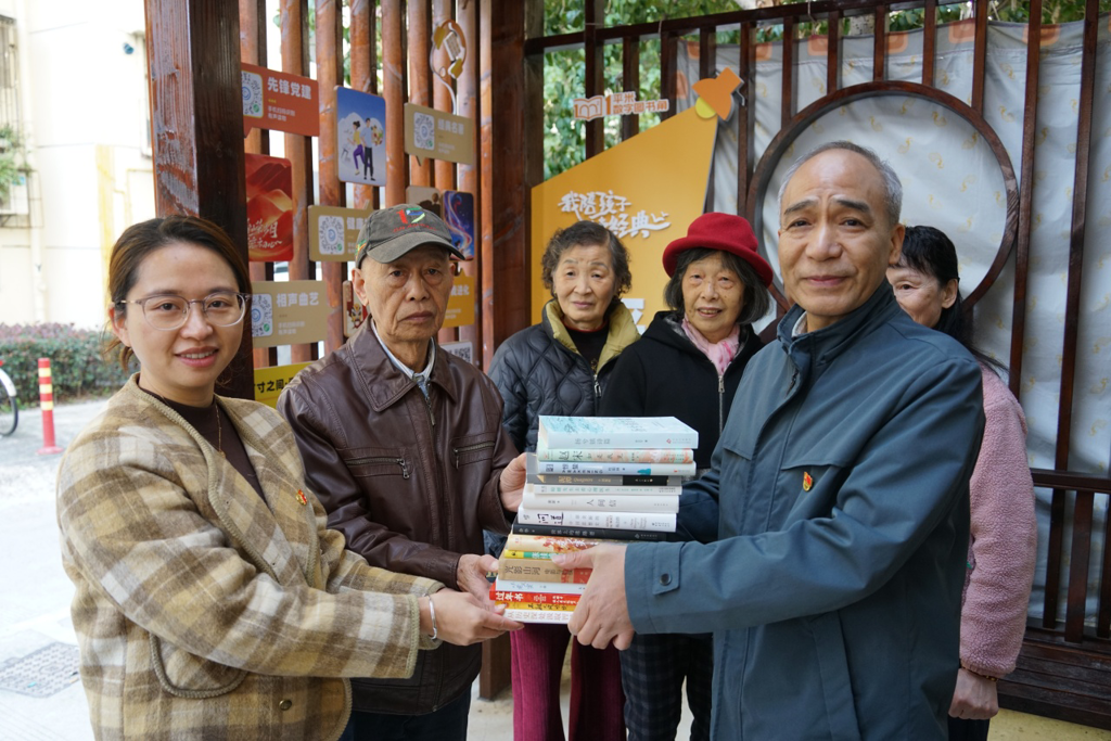 在史家社区,“一平米数字图书角”点位内已开展首场阅读活动。党员志愿者与社区网格员以“一对一”“一对二”结对模式,耐心指导老年居民扫描凉亭内的听书二维码,手把手帮助老人们跨越“数字鸿沟”。“您点这个图标,就能找到养生类有声书了!”志愿者细致地讲解,让老人们逐步掌握查找资源、调节字体、语音朗读等实用功能。活动还特别设置“我陪孩子读经典”银龄温情版块,鄞州区文化特派员范进剑用亲切的宁波方言,讲述了《三字经》《百家姓》中的家风故事,带领老人们朗读经典段落。