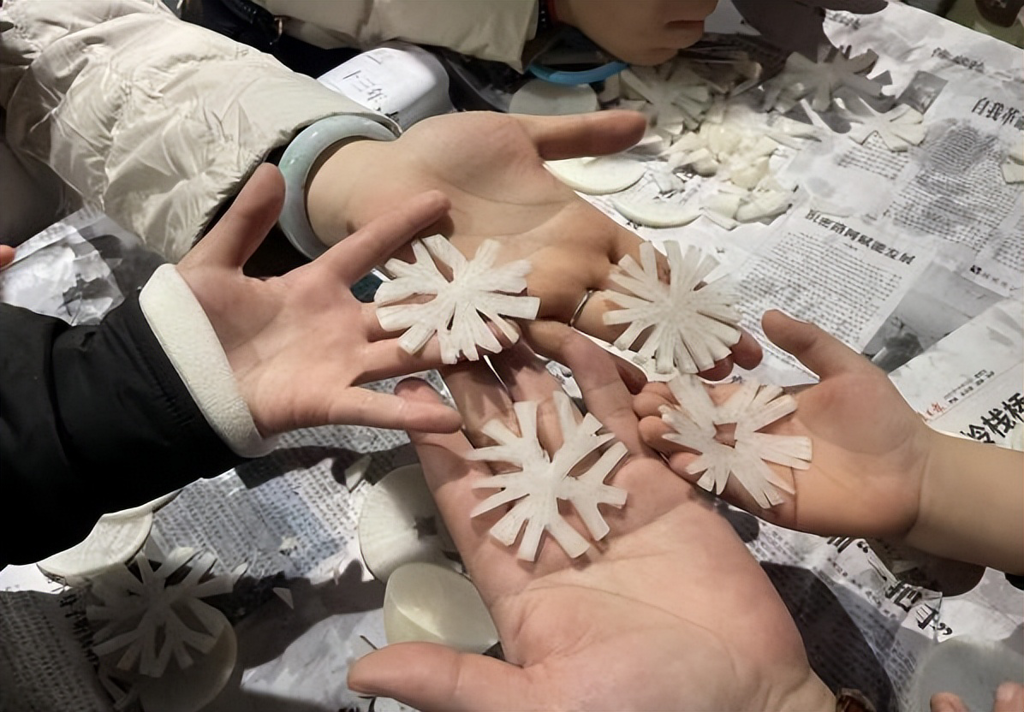 最受期待的白萝卜雕刻雪花环节,孩子们手持刻刀,在萝卜上勾勒、雕琢,从简单的几何纹路到精致的镂空造型,孩子们相互协作、创意碰撞,呈现出形态各异的“魔法雪花”。