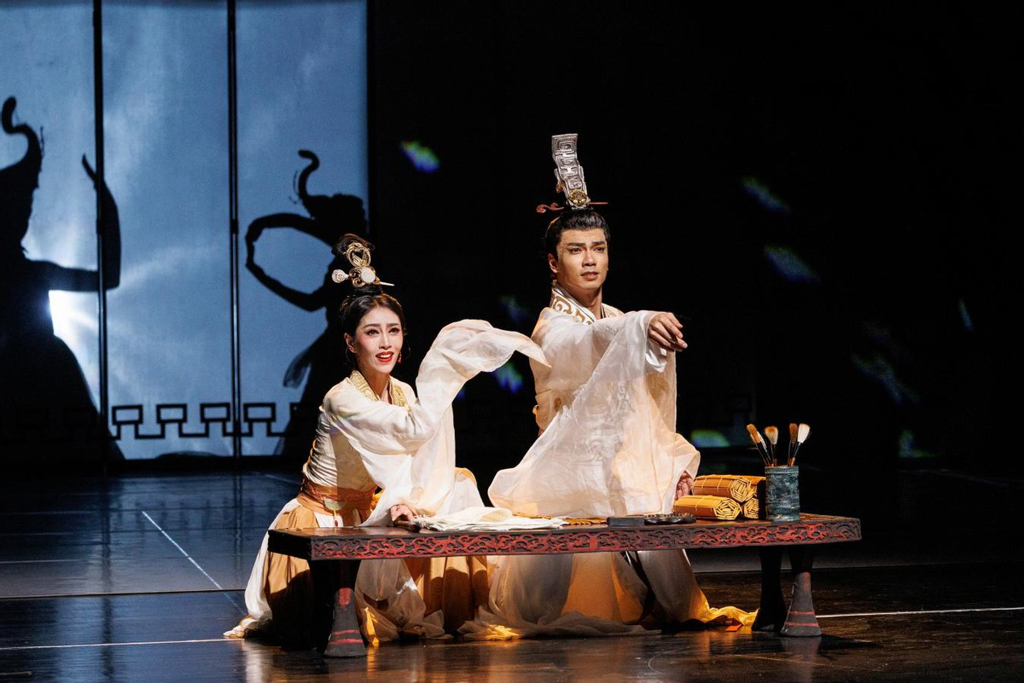 厚积薄发的舞剧《胡笳十八拍》,凝聚着主创团队和本地文艺团队的智慧与实力,主创团队在音乐、舞美、服装、道具等方面反复推敲、精益求精,赋予这部古典作品新的生命力,展现出浓郁的地方特色和文化魅力。舞段创排上,巧妙融合了民族舞与古典舞,生动描绘出东汉末年中华文化的多元面貌。舞美呈现上极尽巧思,以可推拉旋转的卷轴条屏为主体,“大抽象小写实”的手法营造出深远的戏剧视觉效果。音乐创作上,通过不同乐器演绎历史人物和情节,呈现蔡文姬的命运浮沉以及复杂的内心世界。此外,该剧还巧妙融入光影变化、数字技术等多种科技手段,使舞台效果更加立体丰满,淋漓展现新时代舞剧的新魅力。