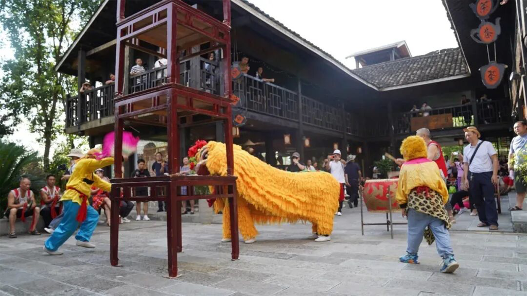 舞狮在高台上或昂首眺望