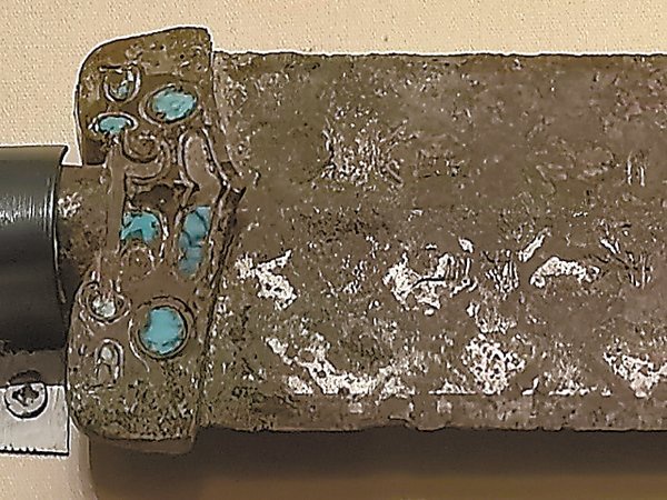 二为剑菱形纹。将这把吴王夫差剑放大后,能清晰看到剑身菱形暗格花纹。如记录吴越历史文化的《越绝书》记载的那样,“扬其华,如芙蓉始出;观其纹,烂如列星之行;观其光,浑浑如水之溢于塘”。