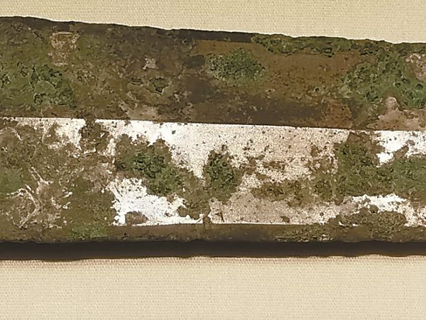 一为剑的寒光。这把吴王夫差剑是复合铸造,即剑脊与剑刃用不同配比的青铜合金二次铸造。剑身中间隆脊有棱,在局部加入不同配比的锡、铅、铁、硫等成分,使其刚柔相济,收分自然。