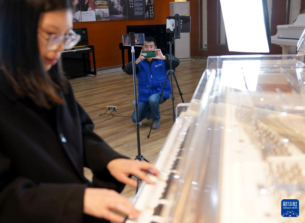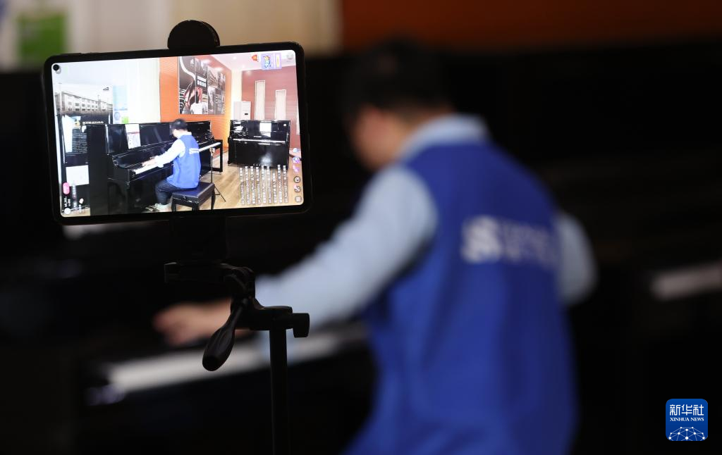 3月23日,德清县洛舍镇东衡村一家钢琴制造企业的工作人员进行直播推介。