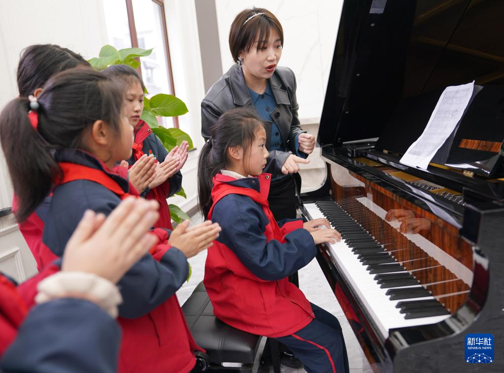 3月23日,德清县洛舍镇中心学校的小学生在钢琴小镇的展示馆内弹奏钢琴。
