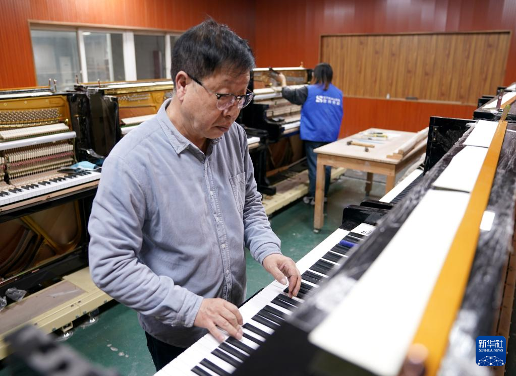 3月23日,来自韩国的钢琴整音师李炳男在德清县洛舍镇东衡村一家钢琴制造企业调试钢琴。