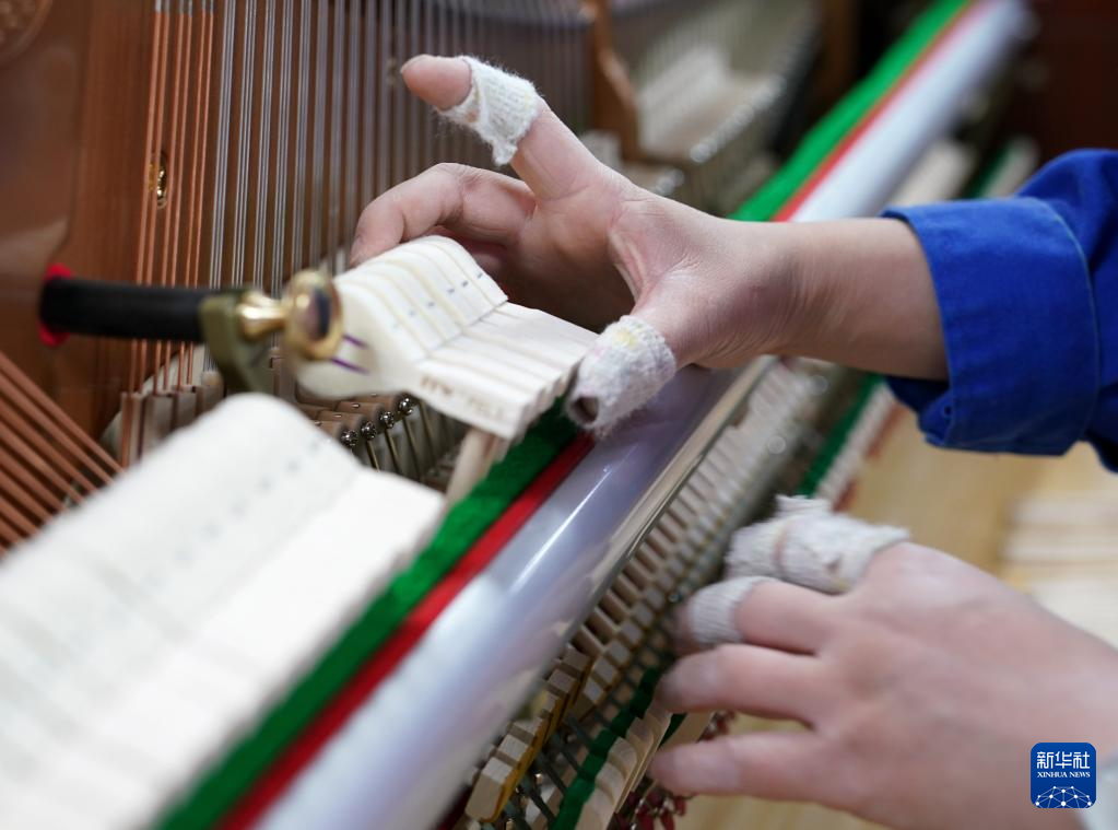 3月23日,工人在德清县洛舍镇东衡村一家钢琴制造企业内装配钢琴。