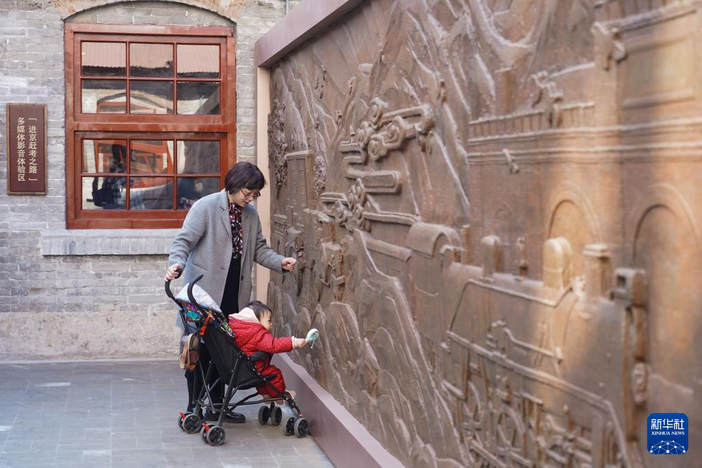 3月25日,一位游客带着孩子参观清华园车站旧址内的一处浮雕。