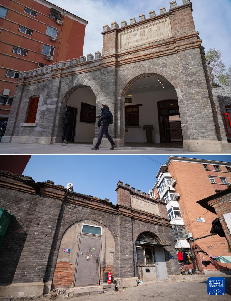 这是一张拼版照片:上图是修缮后对外开放的清华园车站旧址(2023年3月25日摄);下图是修缮前的清华园车站旧址(2021年4月7日摄)。