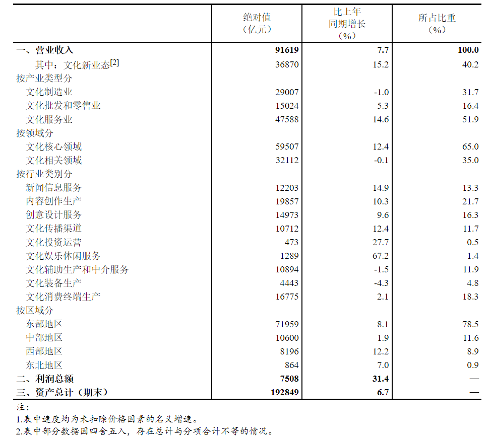 3.文化核心领域包括新闻信息服务、内容创作生产、创意设计服务、文化传播渠道、文化投资运营、文化娱乐休闲服务6个行业,文化相关领域包括文化辅助生产和中介服务、文化装备生产、文化消费终端生产3个行业。