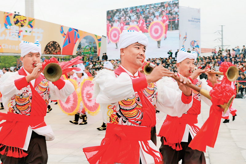 图为2023年10月12日第八届中国成都国际非物质文化遗产节上,陕西省绥米唢呐队伍参加开幕式天府大巡游。 第八届中国成都国际非遗节执委办供图 王帅/摄