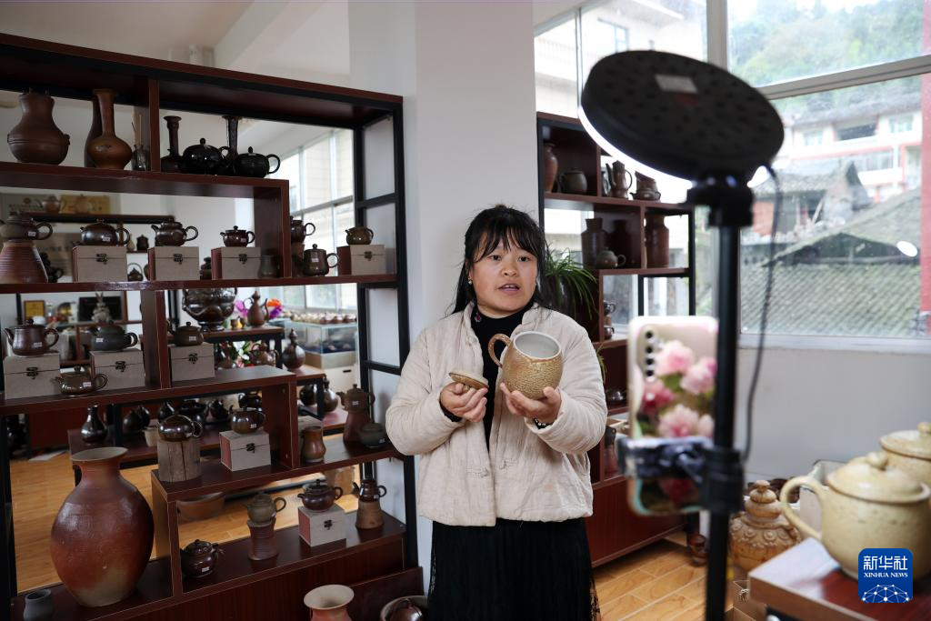 11月11日,在重庆市黔江区濯水镇石鸡坨土陶非遗工坊,工人直播销售土陶产品。