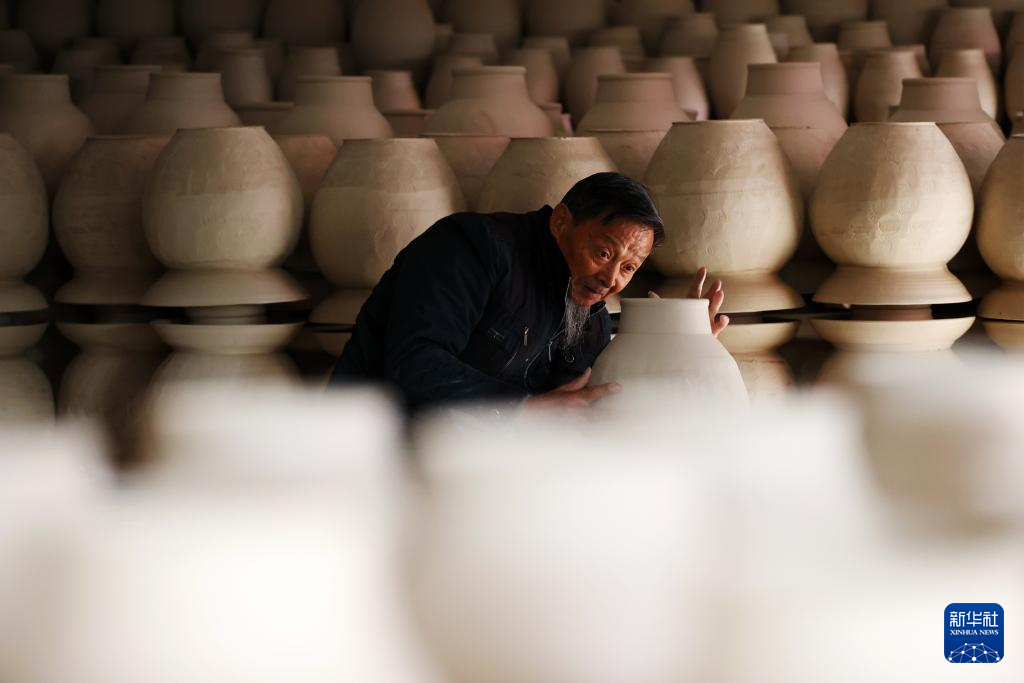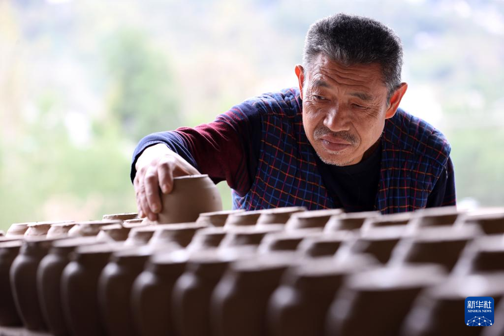 11月11日,在重庆市黔江区濯水镇石鸡坨土陶非遗工坊,工人检查陶坯的干湿度。