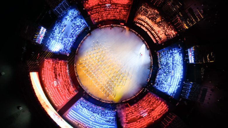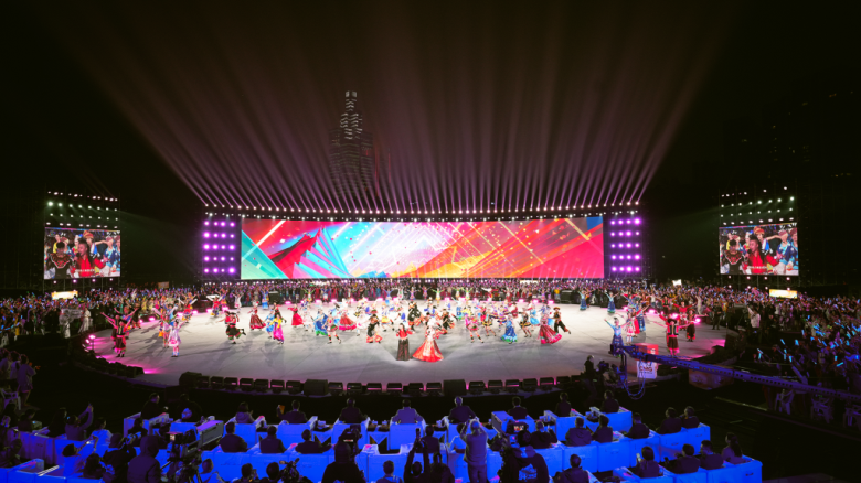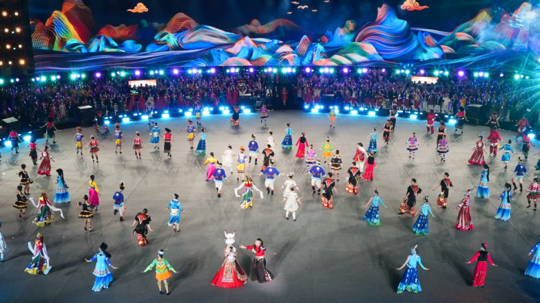 广场舞之夜主舞台造景结合民族大联欢广场特点,以“中国圆”为核心创意理念,体现了中华民族传统文化中对于圆满、团圆的渴望和追求。来自全国不同赛区、不同民族、不同年龄的广场舞爱好者们,围绕主舞台区域起舞表演,呈现出一个精妙的“同心圆”造型。