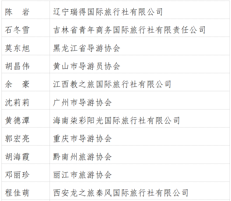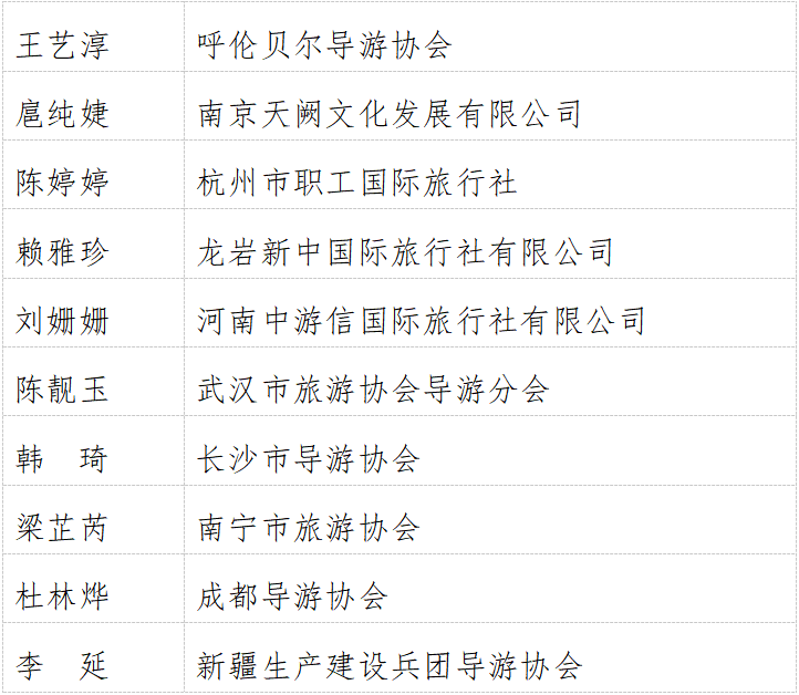由文化和旅游部、中华全国总工会、共青团中央、全国妇联共同举办的第五届全国导游大赛已顺利结束。按照《文化和旅游部 中华全国总工会 共青团中央 全国妇联关于举办第五届全国导游大赛的通知》要求,现将决赛结果通报如下: