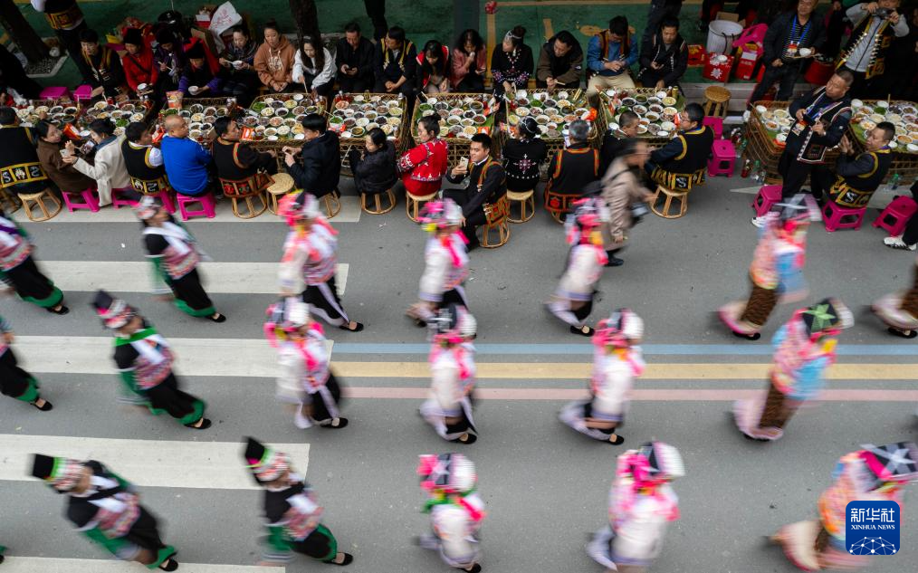 11月19日,绿春县哈尼族群众与游客一起品尝哈尼长街古宴,巡游展演队伍从一旁经过(无人机照片)。