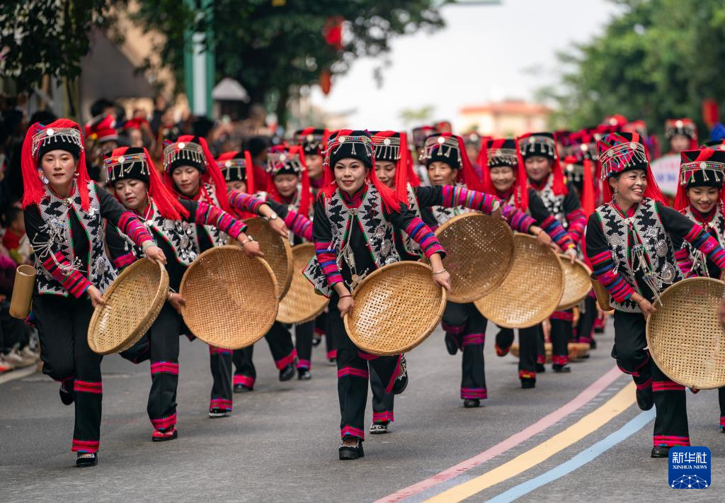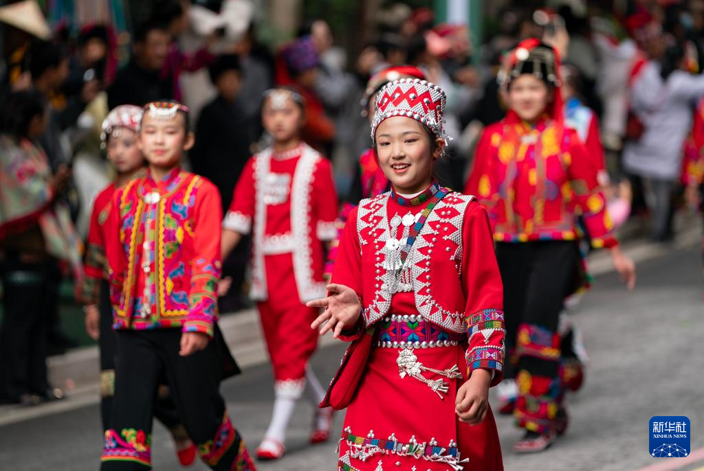 11月19日,绿春县哈尼族群众参加哈尼长街古宴巡游展演。