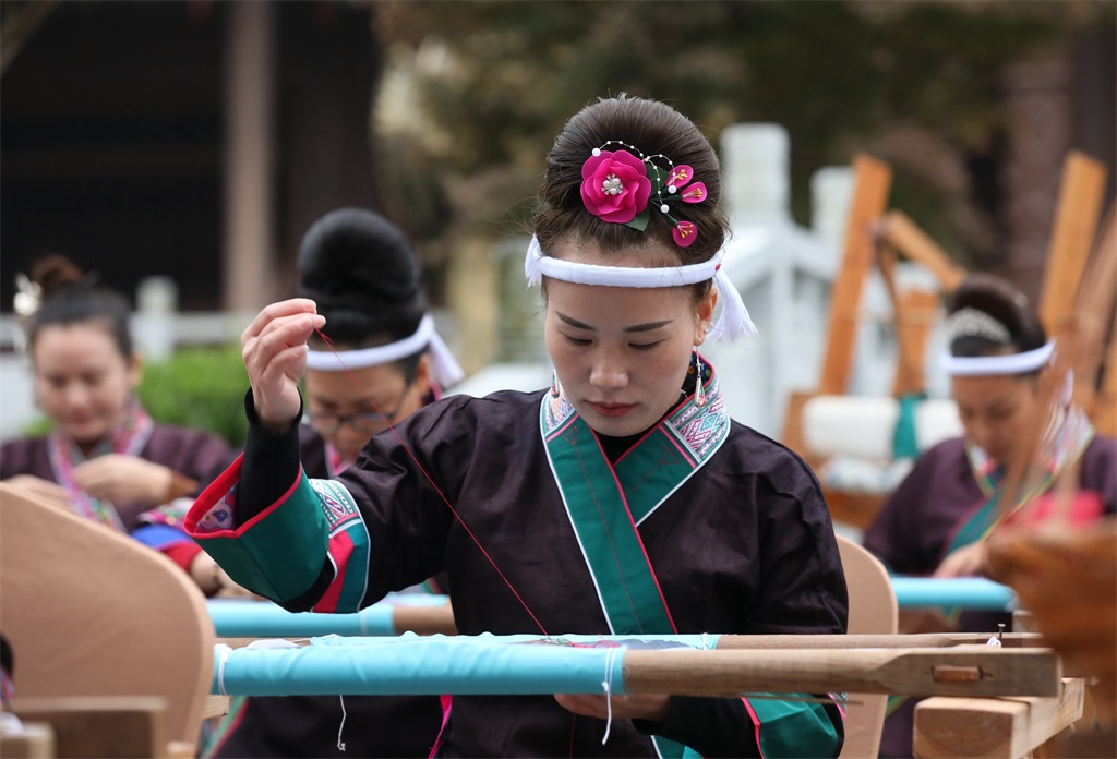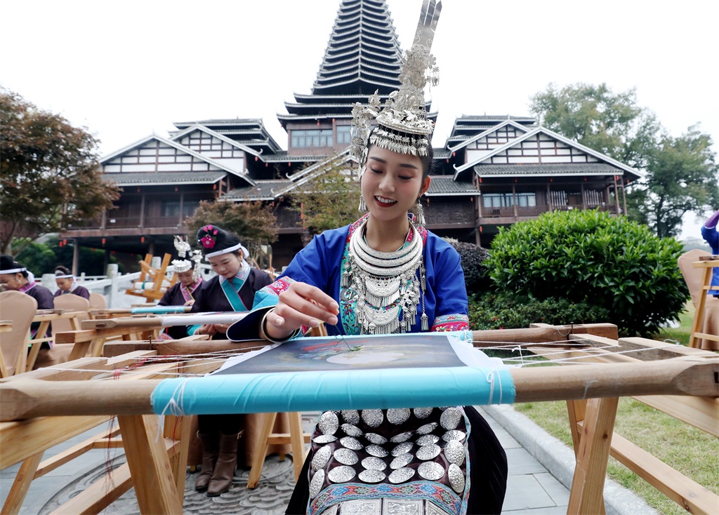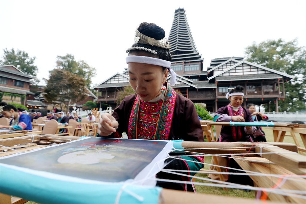 11月30日,2023年“强基工程——中国文联广西三江侗族刺绣”培训项目暨成果展示活动在广西壮族自治区三江侗族自治县侗天宫广场举办,30余名绣娘通过现场刺绣、纺纱展示侗族刺绣技艺之美。