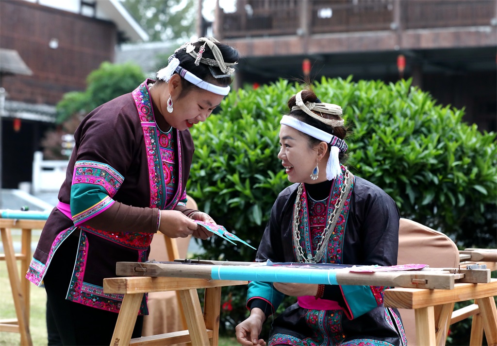 绣娘在展示侗族刺绣技艺 吴练勋 摄