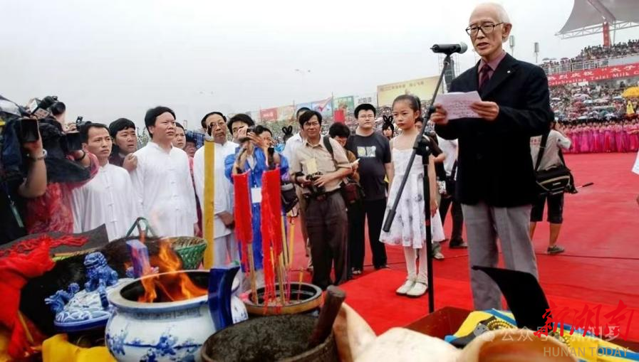 木船靠岸后,余光中先生在众人的簇拥下走到香案前。他穿着一身黑色西装,戴着一副眼镜,微笑着向大家致意,然后转身望向汨罗江。那一刻,我看到他的眼中闪过一丝泪光。也许,这位以《乡愁》闻名的诗人,在这片承载着屈原精神的土地上,找到了某种心灵的归宿。